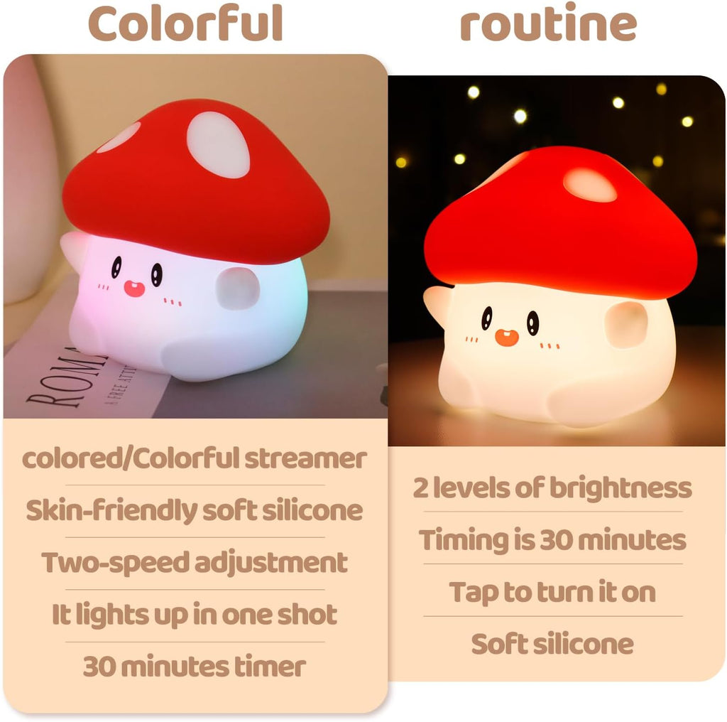 • Two Magical Modes in One Adorable Mushroom Flip the bottom switch to transform your mood! Choose the warm, steady glow for bedtime, or switch to Color-Changing Mode to tap through vibrant red, green, blue, and a soothing rainbow fade. It’s a nightlight and an ambient party lamp—all inside one squishy, cute mushroom.